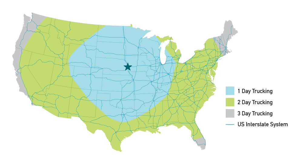 Omaha sits at the crossroads of America’s highway system, where Interstates I-80 and I-29 connect regional and national commerce. This strategic location gives companies efficient trucking access to key U.S. markets, with two-day delivery available to most of the country. A regional trucking time map highlights Omaha’s reach.
